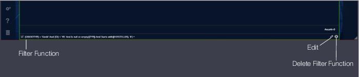 A filter equation consists of the column name (blue text) of the column to be filtered by, the filter condition (green text) and the filter value (white text). The number of filter values depends on the filter condition.